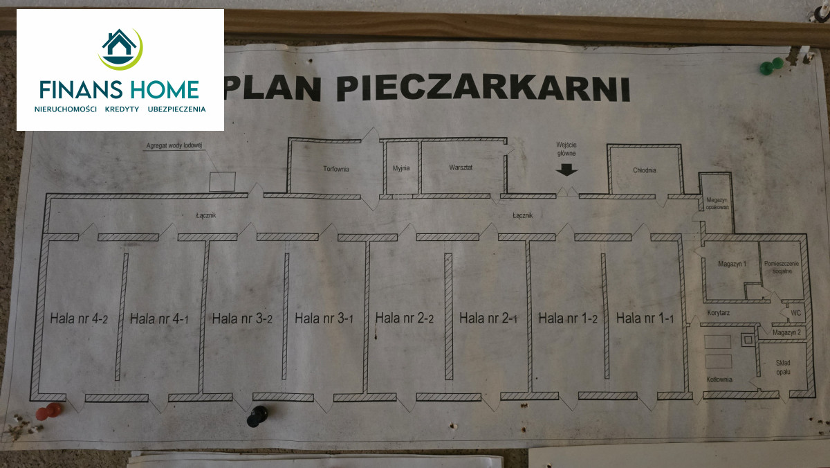 Budynek składa się z 8 podobnej wielkości, osobnych pomieszczeń (po około 65m2 każdy), długiego łącznika, tortowni, myjni, warsztatu, chłodni z wyposażeniem, trzech magazynów, pomieszczenia socjalnego, wc, kotłowni oraz pomieszczenia na skład opału z osobnym wejściem. Na działce dodatkowo pomieszczenia gospodarcze w sąsiednim budynku.